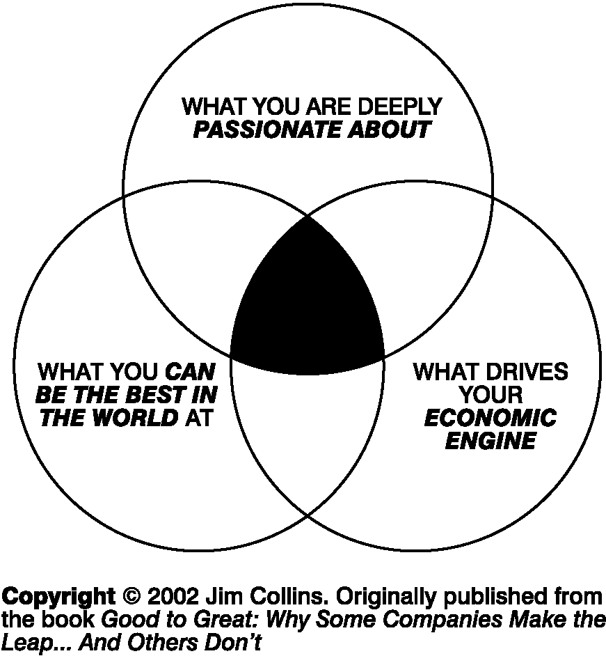 Great companies figure out what they really want to do (passion for their endeavor,) dedicate themselves at doing it really well (world class excellence) and figure out the key elements to making a profit at the endeavor (economic engine.)