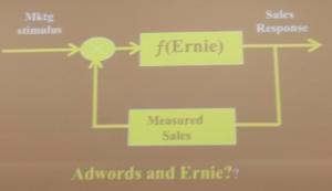 Dr. Lee demonstrated the slide of a closed loop control system applied to marketing. The system feeds a market stimulus to the function Ernie. Ernie reacts to the stimulus as a sales response and the response feedback returns to the system and function (Ernie) reshapes to improve sales response. The process continues until the sales improve. Measured sales feedback statistics are obtained with Google analytics. The strength of the control loop is the feedback.